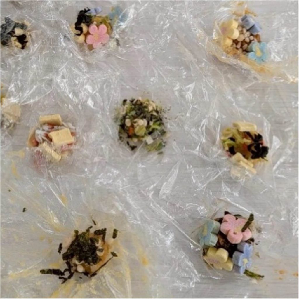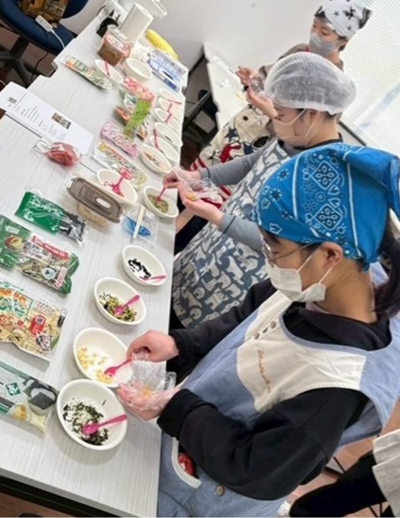 麦味噌と赤味噌の2つをそれぞれ1食ずつラップに丸く取り、乾燥野菜や乾燥わかめ、ねぎ、赤エビ、あおさ、しらす干し、揚げ玉やごま、麩や海苔など色々な具材を準備し、味噌に練りこんだり、上にトッピングをしました。ラップに具材がくっつくので、皆さんは映える写真を撮るのに一番苦戦されていましたが、簡単に可愛らしい具沢山のみそ玉が出来ました。試食では「味噌汁に初めてしらす干しを入れたけれど美味しい」「これとおにぎりがあったら簡単に昼食が自分で作れそう」等の感想が聞かれました。次回は本格的な料理にも挑戦したいとの感想もあり、わいわい楽しく料理に親しむ機会となりました。