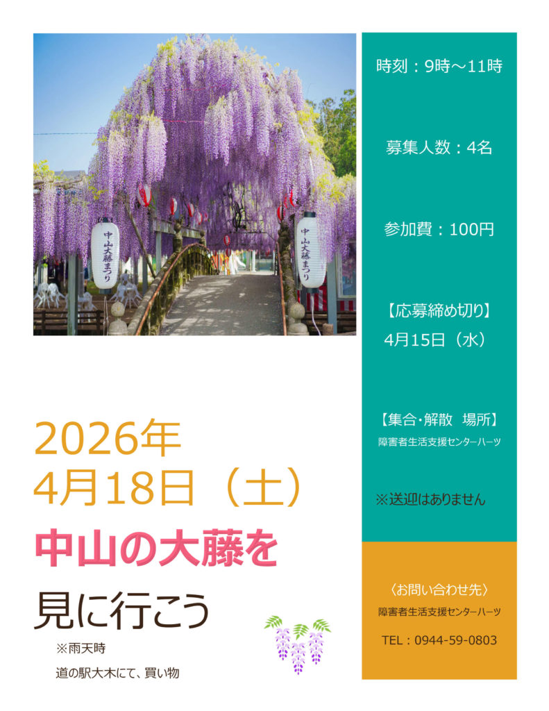2026年4月18日(土)に中山の大藤を、見に行きませんか?ぜひ、ご参加お待ちしております♪